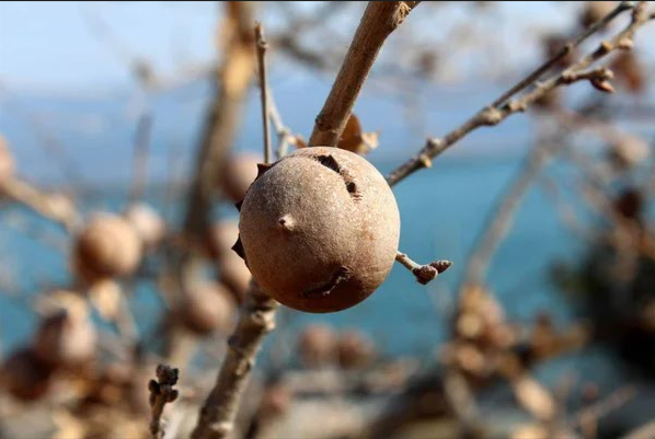 Esas esferas son las agallas del roble y son el resultado de una formación tumoral defensiva provocada por la punción y posterior depósito de un huevo por parte de un organismo cecidógeno, es decir un insecto que forma cecidias o agallas en plantas. La presencia del elemento extraño provoca la formación de la agalla que también sirve al insecto como medio nutricional y de resguardo hasta su eclosión y posterior salida. Las agallas recién formadas son muy ricas en taninos, principal compuesto químico que se extrae mediante su triturado y posterior maceración o cocción en agua.